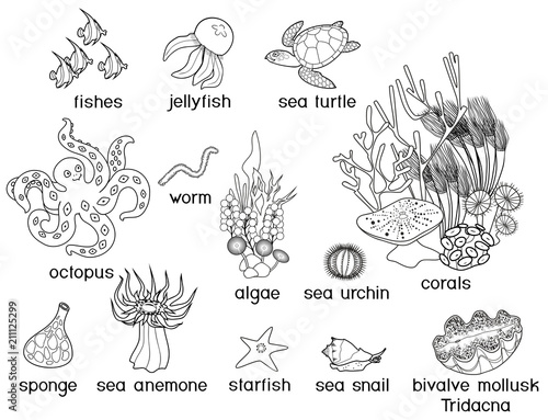Coloring Page Different Underwater Marine Animals With Titles Buy This Stock Vector And Explore Similar Vectors At Adobe Stock Adobe Stock